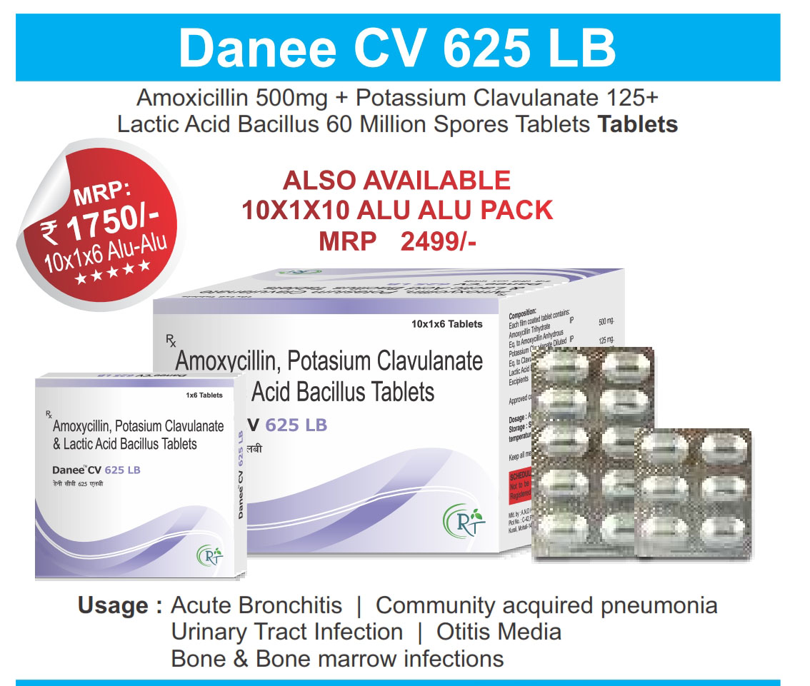 The Brand Name DANEE CV 625 LB ® Has Generic Salt :: Amoxicillin 500mg + Potassium Clavulanate 125mg + Lactic Acid