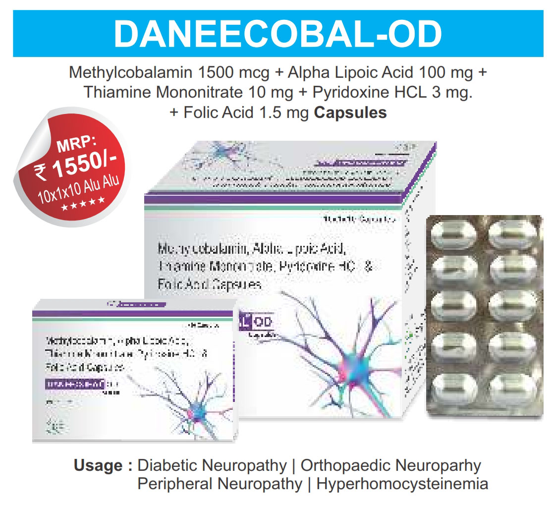 The Brand Name DANEECOBAL OD ® Has Generic Salt :: Methylcobalamin IP 1500mcg + Alpha Lipoic Acid USP 100mg + Thiamine Mononitrate IP 10mg + Pyridoxine HCL IP 3mg + Folic Acid IP 1.5mg