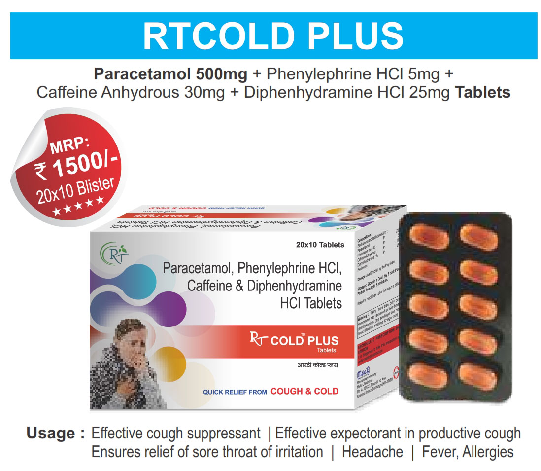 The Brand Name RT COLD PLUS ® Has Generic Salt :: Paracetamol 500mg + Pheylephrine HCL 5mg + Caffeine Anhydrous 30mg + Diphenhydramine HCL 25mg