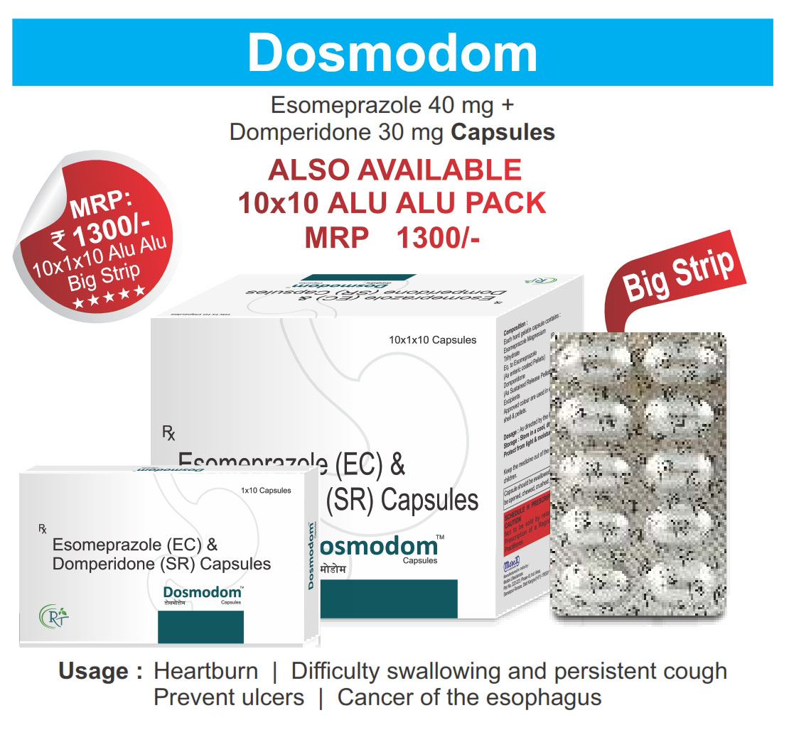 The Brand Name Has Generic Salt :: DOSMODOM :: 10x1x10 Is From Company :: Not Available Priced MRP Approx. :: Rs. 140 DOSMODOM :: 10x1x10 have is comes under Sub class of Main Class The Brand Name DOSMODOM ® Has Generic Salt :: Esomeprazol (EC) 40mg + Domperidone (SR) 30mg DOSMODOM...