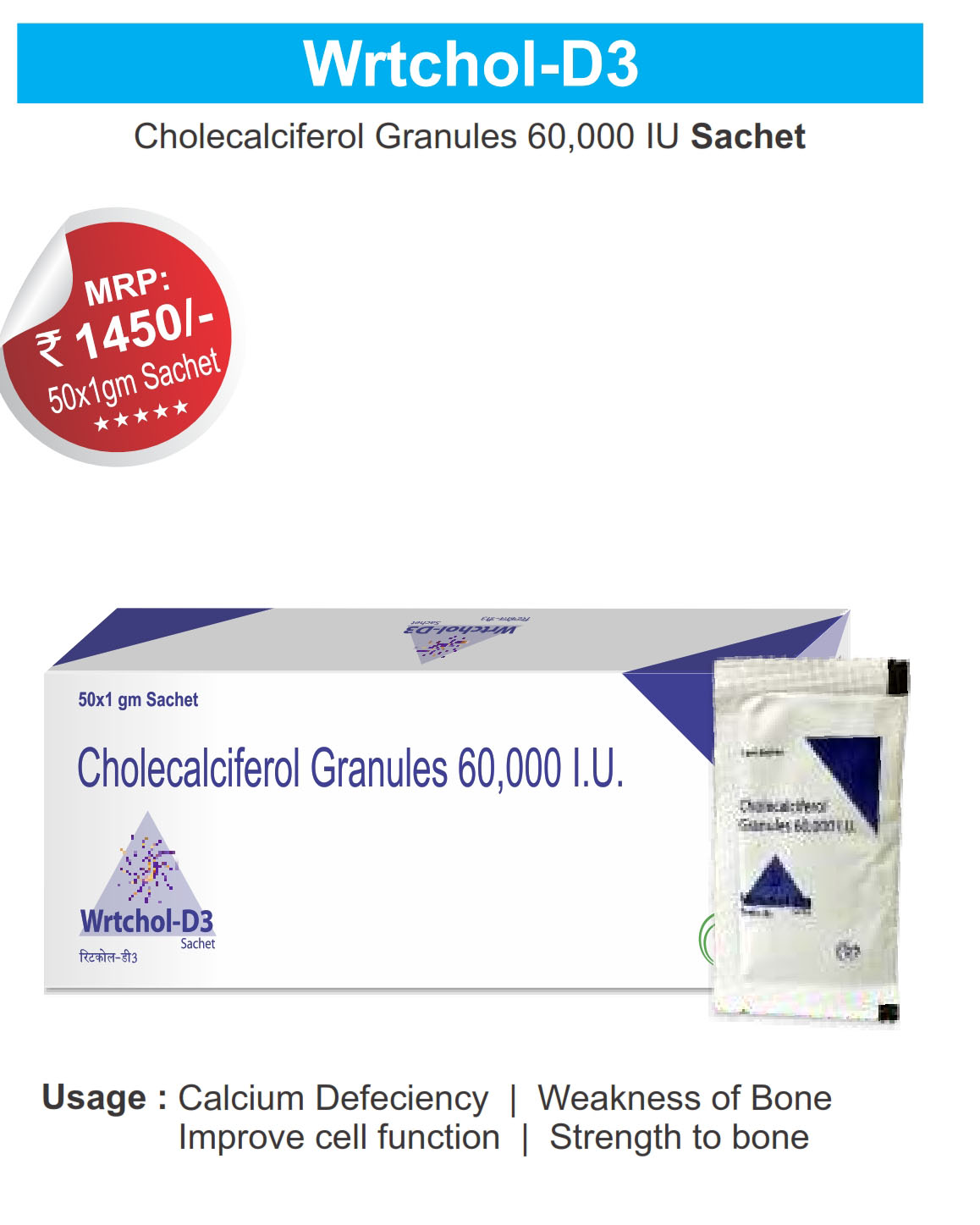 The Brand Name Has Generic Salt :: WRTCHOL-D3 :: 50x1gm Is From Company :: Not Available Priced MRP Approx. :: Rs. 0.58 WRTCHOL-D3 :: 50x1gm have is comes under Sub class of Main Class The Brand Name WRTCHOL-D3 ® Has Generic Salt :: “Each 1Gm Sachet Contains: Cholecalciferol I.P 60000 I.UExcipients...