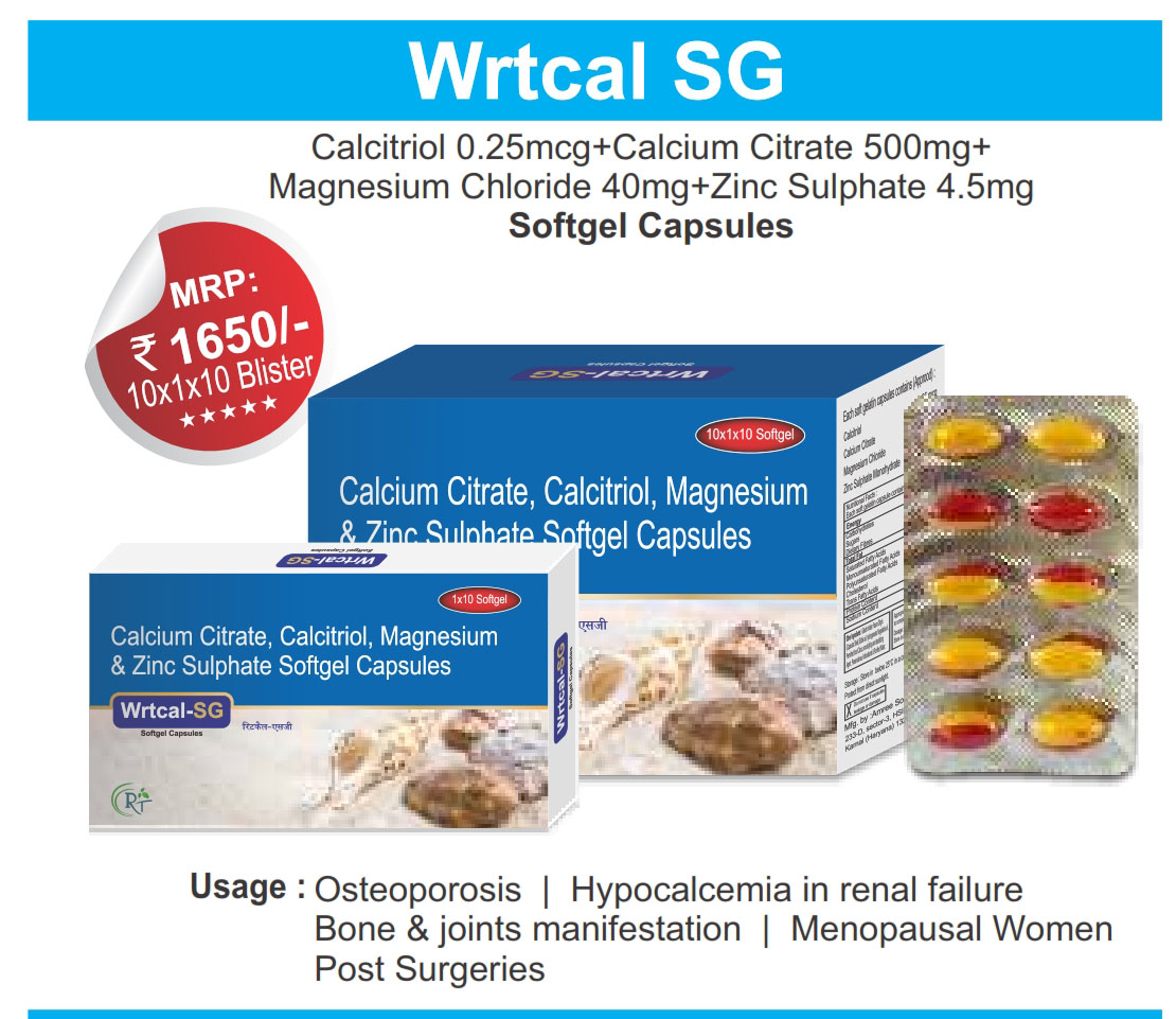 The Brand Name Has Generic Salt :: WRTCAL SG :: 10X1X10 Is From Company :: Not Available Priced MRP Approx. :: Rs. 165 WRTCAL SG :: 10X1X10 have is comes under Sub class of Main Class The Brand Name WRTCAL SG ® Has Generic Salt :: Calcium Carbonate 500mg Calcitrol 0.25mcg...