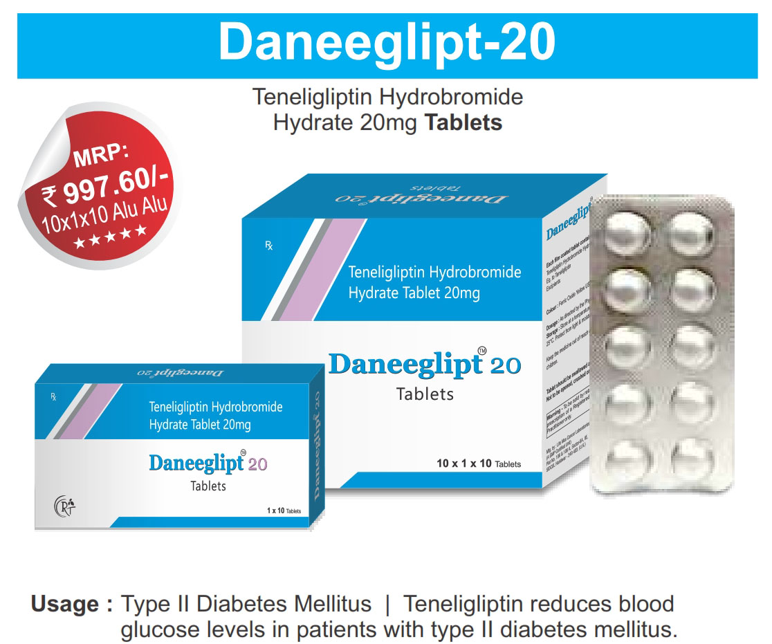 The Brand Name  Has Generic Salt :: DANEEGLIPT-20 :: 10x1X10  Is From Company :: Not Available   Priced MRP Approx. :: Rs. 99.76 DANEEGLIPT-20 :: 10x1X10 have is comes under Sub class  of  Main Class The Brand Name DANEEGLIPT-20 ® Has Generic Salt :: Teneligliptin 20mg DANEEGLIPT-20 ®   Packing :: 10x1X10 Main Medicine...