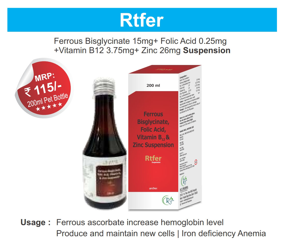 The Brand Name  Has Generic Salt :: RTFER :: 200ml  Is From Company :: Not Available   Priced MRP Approx. :: Rs. 115 RTFER :: 200ml have is comes under Sub class  of  Main Class The Brand Name RTFER ® Has Generic Salt :: Each 5ml Contains :Ferric Bisglycinate Eqv.to Elemental Iron...
