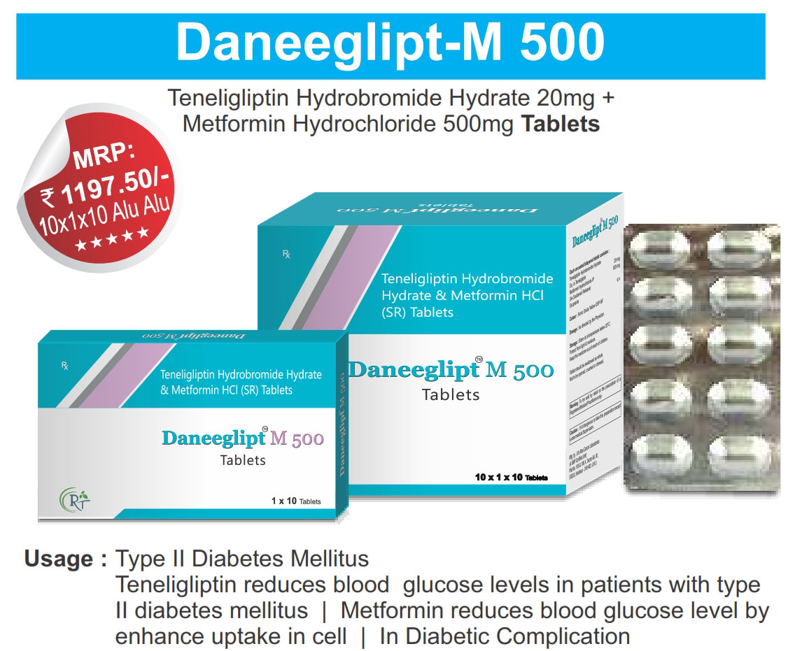 The Brand Name Has Generic Salt :: DANEEGLIPT- M 500 :: 10x1X10 Is From Company :: Not Available Priced MRP Approx. :: Rs. 119.75 DANEEGLIPT- M 500 :: 10x1X10 have is comes under Sub class of Main Class The Brand Name DANEEGLIPT- M 500 ® Has Generic Salt :: Teneligliptin 20mg...