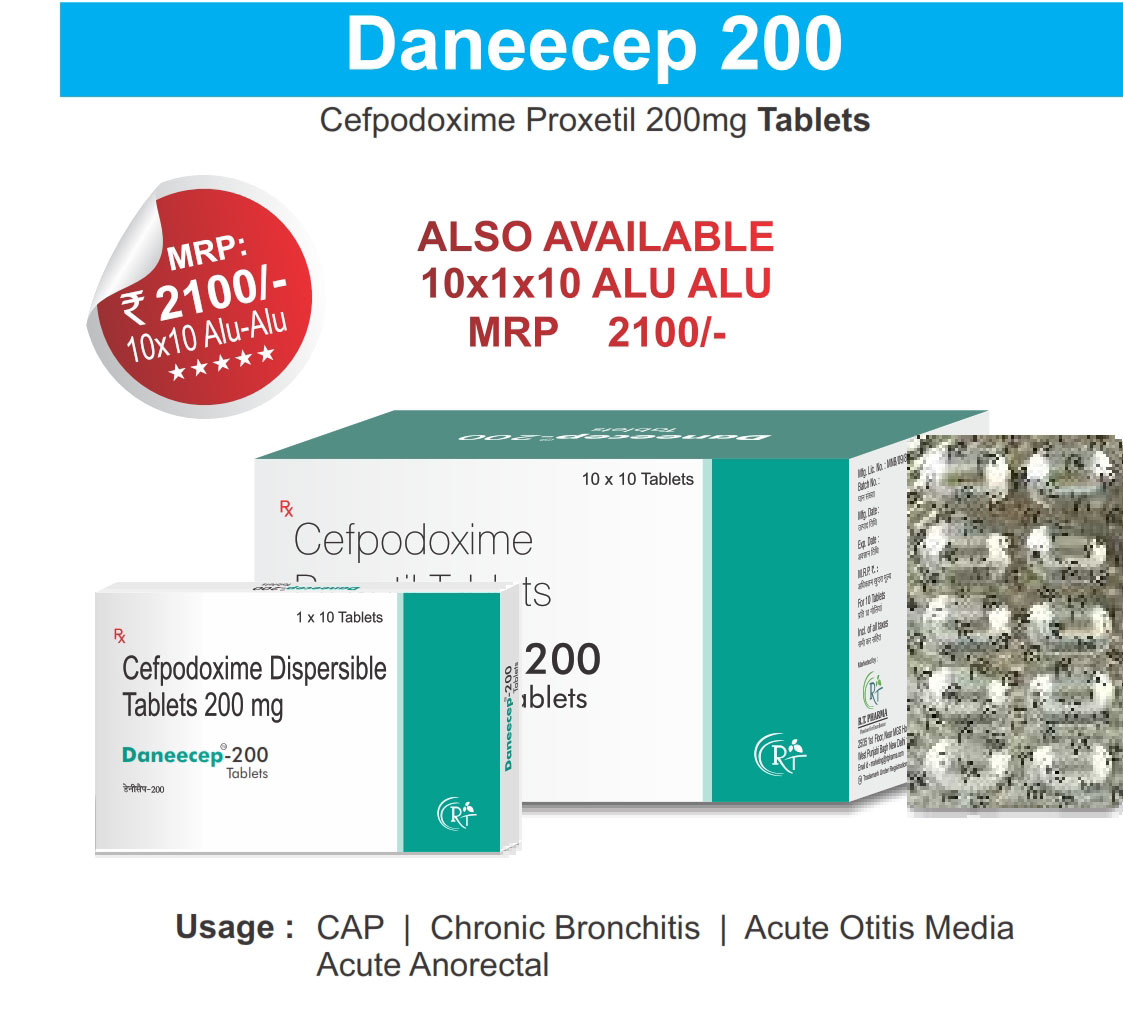 The Brand Name Has Generic Salt :: DANEECEP 200 :: 10x1x10 Is From Company :: Not Available Priced MRP Approx. :: Rs. 210 DANEECEP 200 :: 10x1x10 have is comes under Sub class of Main Class The Brand Name DANEECEP 200 ® Has Generic Salt :: Cefpodoxime Dispersible Tablet 200mg DANEECEP...