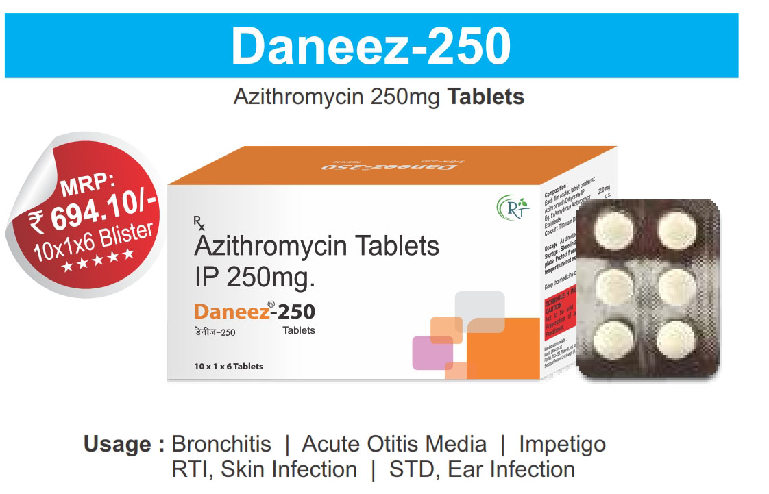The Brand Name Has Generic Salt :: DANEEZ-250 :: 10x1x6 Is From Company :: Not Available Priced MRP Approx. :: Rs. 69.41 DANEEZ-250 :: 10x1x6 have is comes under Sub class of Main Class The Brand Name DANEEZ-250 ® Has Generic Salt :: Azithromycin 250mg DANEEZ-250 ® Packing :: 10x1x6 Main Medicine...