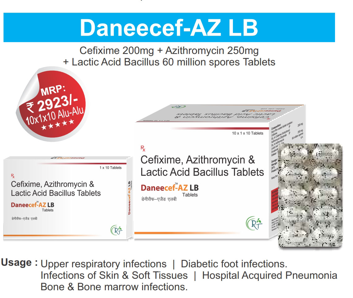 The Brand Name Has Generic Salt :: DANEECEF-AZ LB :: 10X1X10 Is From Company :: Not Available Priced MRP Approx. :: Rs. 292.3 DANEECEF-AZ LB :: 10X1X10 have is comes under Sub class of Main Class The Brand Name DANEECEF-AZ LB ® Has Generic Salt :: Cefixime 200mg+Azithromycin 250mg+Lactic Acid Bacillus...