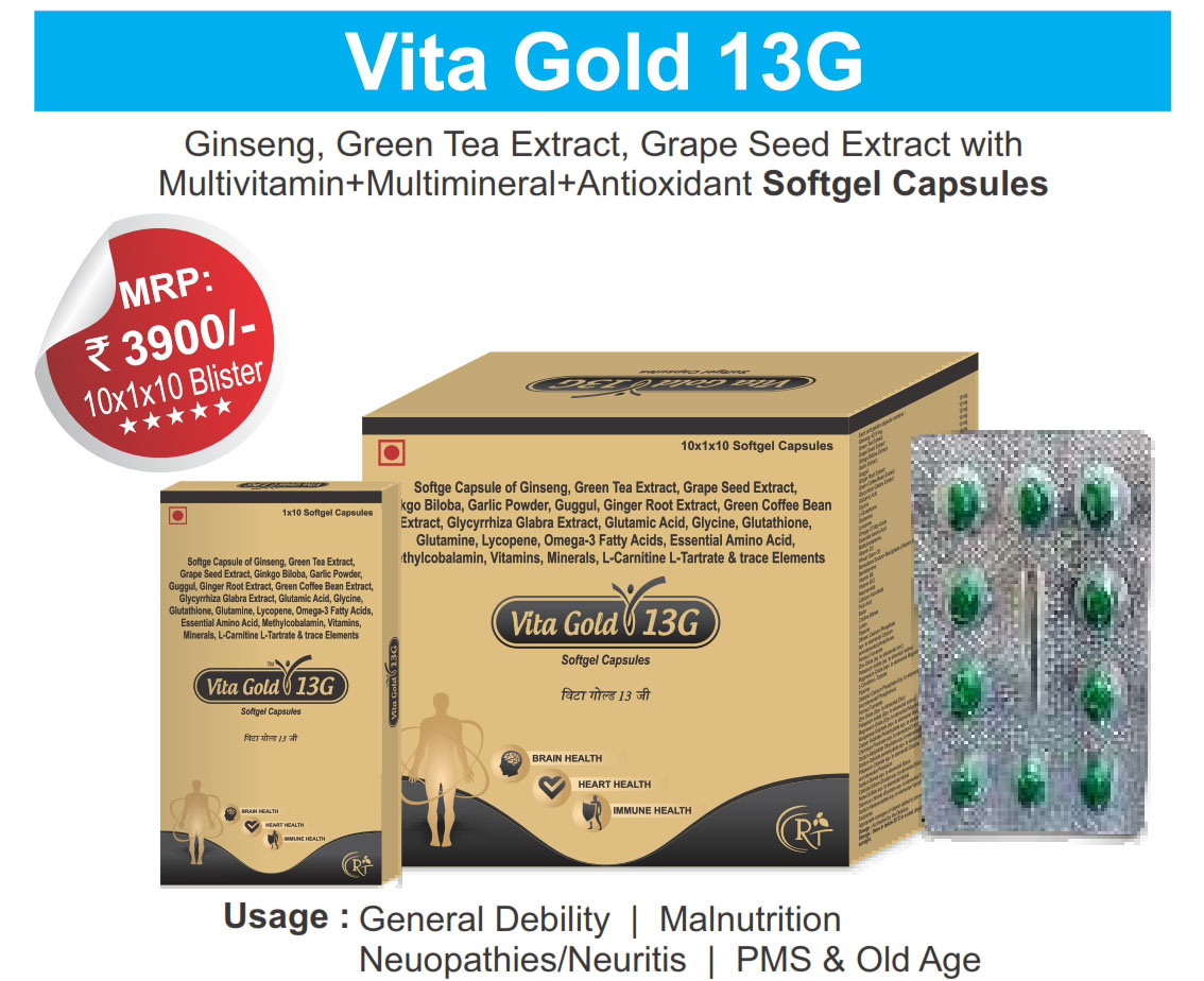 The Brand Name Has Generic Salt :: VITA GOLD 13G :: 10X1X10 Is From Company :: Not Available Priced MRP Approx. :: Rs. 390 VITA GOLD 13G :: 10X1X10 have is comes under Sub class of Main Class The Brand Name VITA GOLD 13G ® Has Generic Salt :: Omega-Fatty acid,EPA,DHA,green...