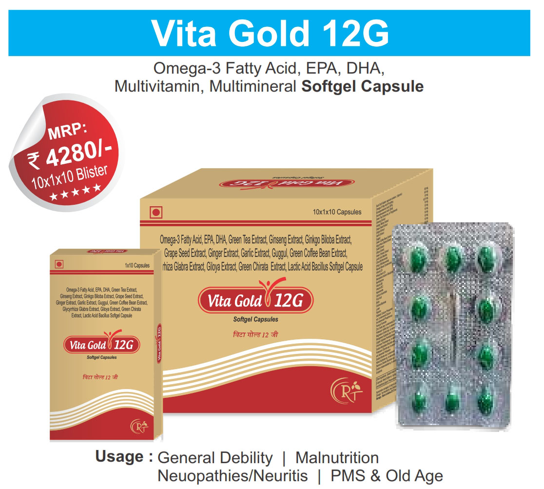 The Brand Name Has Generic Salt :: VITA GOLD 12G :: 10X1X10 Is From Company :: Not Available Priced MRP Approx. :: Rs. 428 VITA GOLD 12G :: 10X1X10 have is comes under Sub class of Main Class The Brand Name VITA GOLD 12G ® Has Generic Salt :: Omega-Fatty acid,EPA,DHA,green...