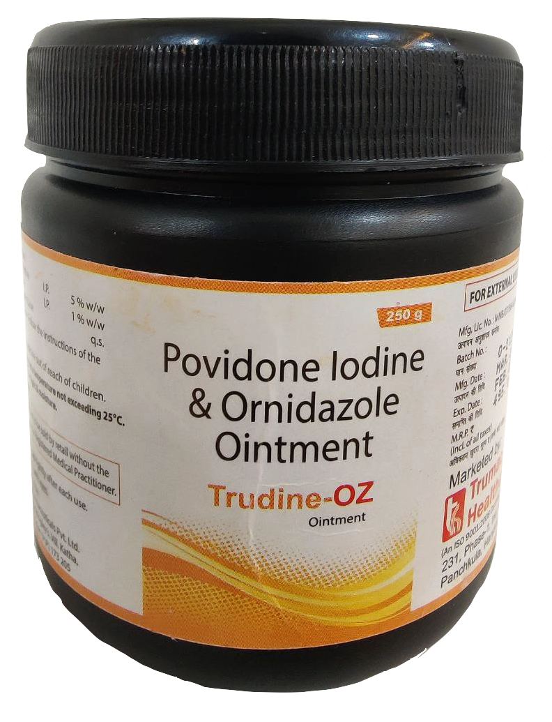 The Brand Name Has Generic Salt :: Povidone,Iodine,w/w,Ornidazole,w/w TRUDINE-OZ (Ointment) :: 250gm Jar Is From Company :: Not Available Priced MRP Approx. :: Rs. 495 TRUDINE-OZ (Ointment) :: 250gm Jar have is comes under Sub class of Main Class The Brand Name TRUDINE-OZ (Ointment) ® Has Generic Salt :: Povidone Iodine (5%...