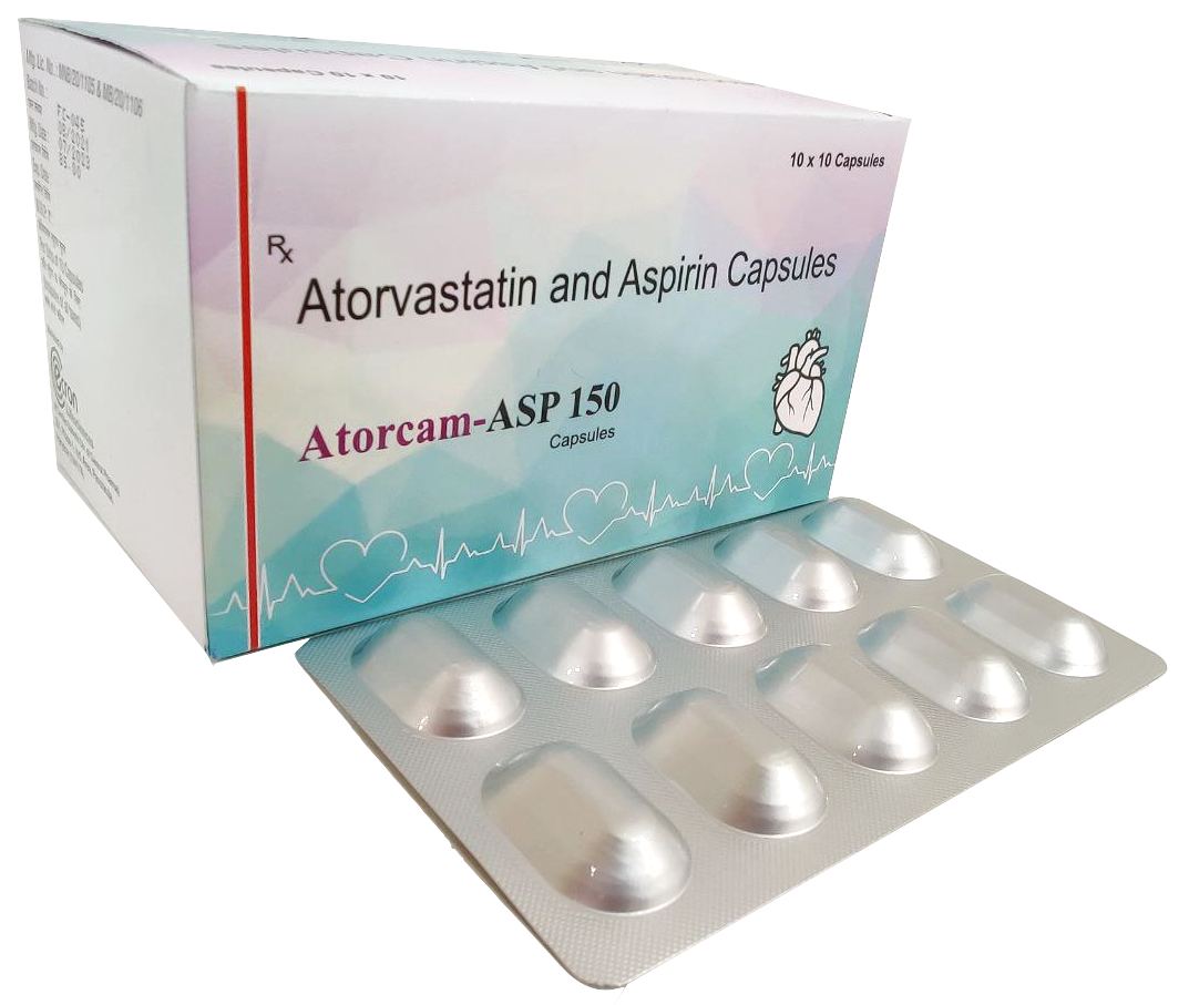 The Brand Name Has Generic Salt :: Atorvastatin,Calcium,Aspirin ATORCAM-ASP 150 (Caps) :: 10 x 10 (Alu-Alu) Is From Company :: Not Available Priced MRP Approx. :: Rs. 85 ATORCAM-ASP 150 (Caps) :: 10 x 10 (Alu-Alu) have is comes under Sub class of Main Class The Brand Name ATORCAM-ASP 150...