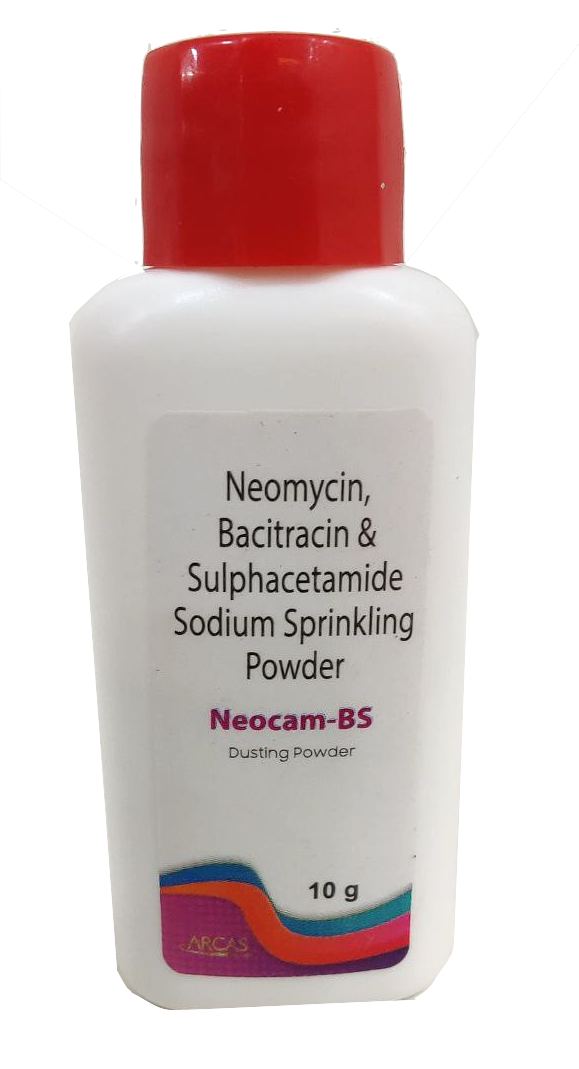 The Brand Name Has Generic Salt :: Sulphacetamide,Neomycin,Bacitracin NEOCAM-BS (Sprinkling Powder) :: 10gm Is From Company :: Not Available Priced MRP Approx. :: Rs. 90 NEOCAM-BS (Sprinkling Powder) :: 10gm have is comes under Sub class of Main Class The Brand Name NEOCAM-BS (Sprinkling Powder) ® Has Generic Salt :: Sulphacetamide (60mg)...