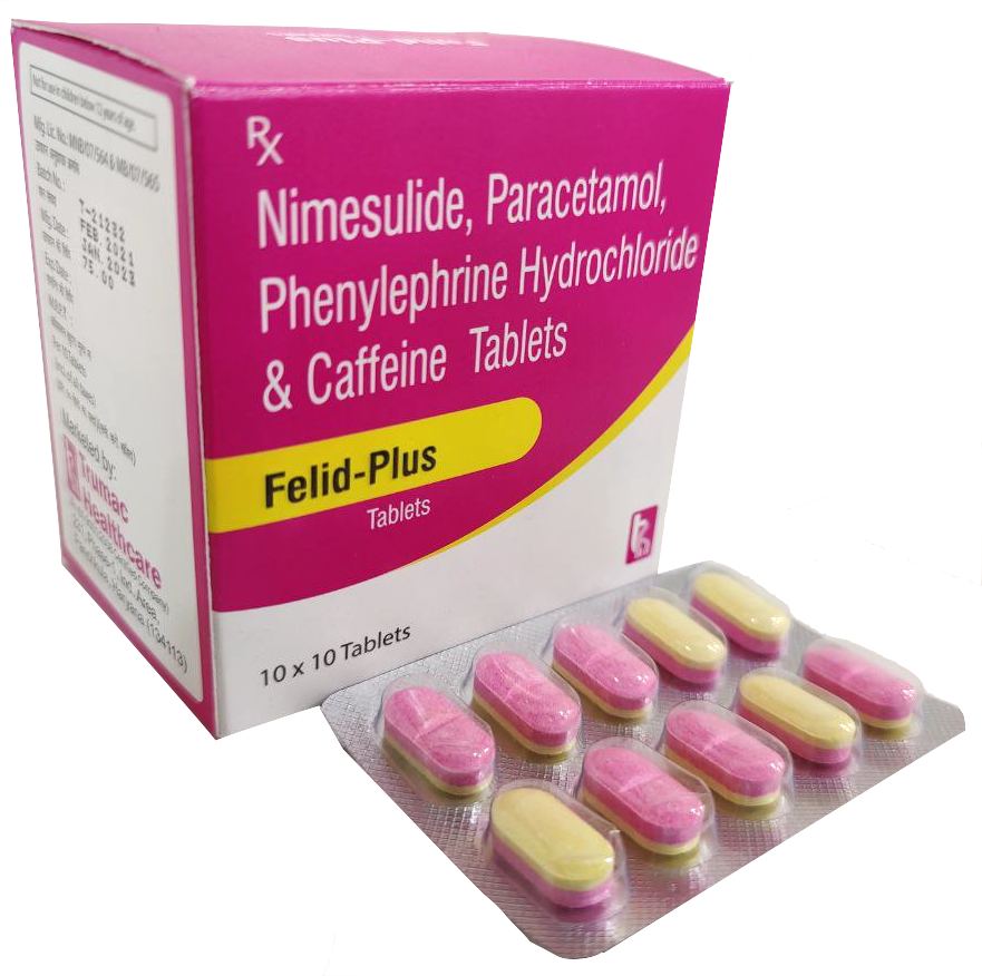 The Brand Name Has Generic Salt :: Nimesulide,Paracetamol,Phenylehprine,Caffeine,Bilayer FELID-PLUS :: 10 x 10 (Blister) Is From Company :: Not Available Priced MRP Approx. :: Rs. 75 FELID-PLUS :: 10 x 10 (Blister) have is comes under Sub class of Main Class The Brand Name FELID-PLUS ® Has Generic Salt :: Nimesulide 100mg...
