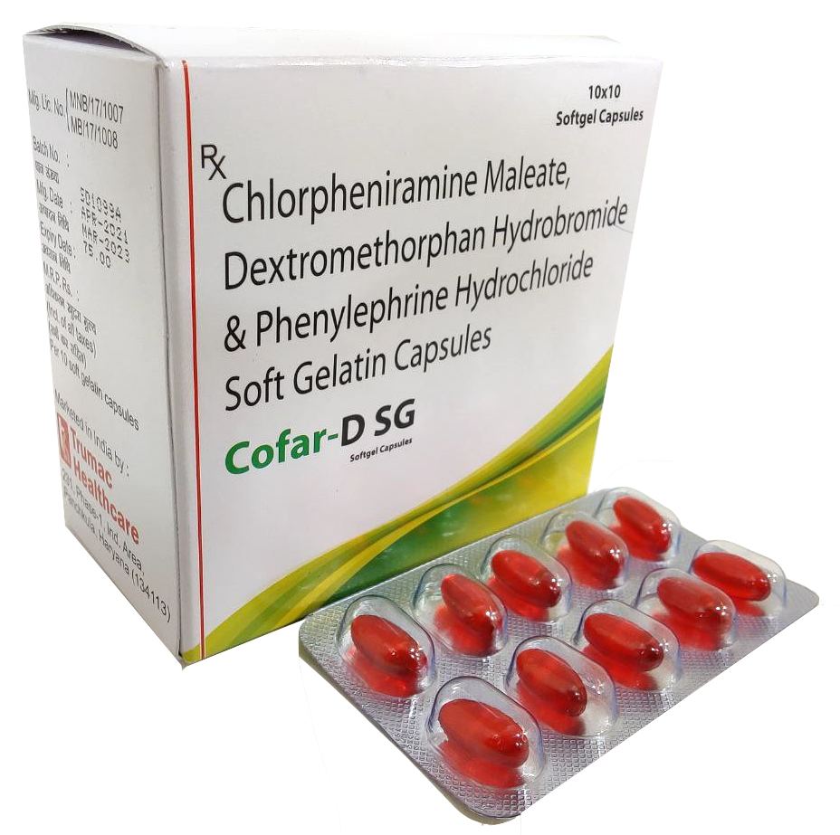 The Brand Name Has Generic Salt :: Phenylephrine,Chlorpheniramine,Maleate,Dextromethorphan,Hydrobromide,Soft,Gel COFAR-D (Soft Gel) :: 10 x 10 (Blister) Is From Company :: Not Available Priced MRP Approx. :: Rs. 75 COFAR-D (Soft Gel) :: 10 x 10 (Blister) have is comes under Sub class of Main Class The Brand Name COFAR-D (Soft...