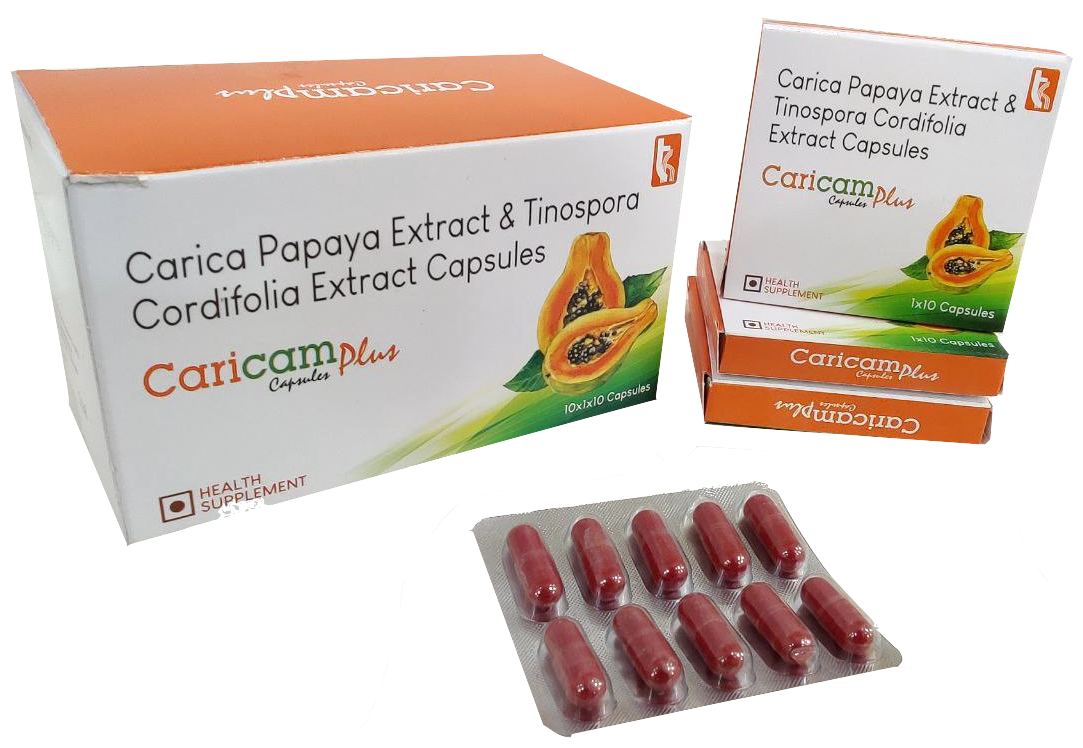 The Brand Name Has Generic Salt :: Carica,Papaya,Extract,Tinospora,Cordifolia,Extract CARICAM-PLUS (Caps) :: 10 x 1 x 10 (Blister) Is From Company :: Not Available Priced MRP Approx. :: Rs. 180 CARICAM-PLUS (Caps) :: 10 x 1 x 10 (Blister) have is comes under Sub class of Main Class The Brand Name...