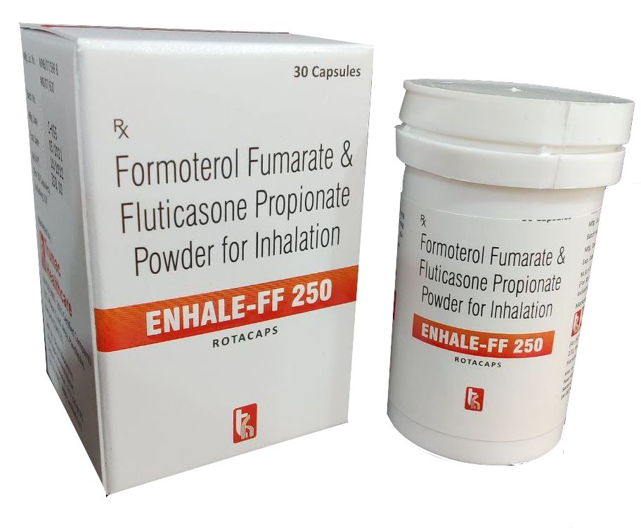 The Brand Name Has Generic Salt :: Fluticasone,Propionate,Formoterol,Fumarate ENHALE-FF 250 (Rotacaps) :: Bottle (30 Caps) Is From Company :: Not Available Priced MRP Approx. :: Rs. 388 ENHALE-FF 250 (Rotacaps) :: Bottle (30 Caps) have is comes under Sub class of Main Class The Brand Name ENHALE-FF 250 (Rotacaps) ® Has...