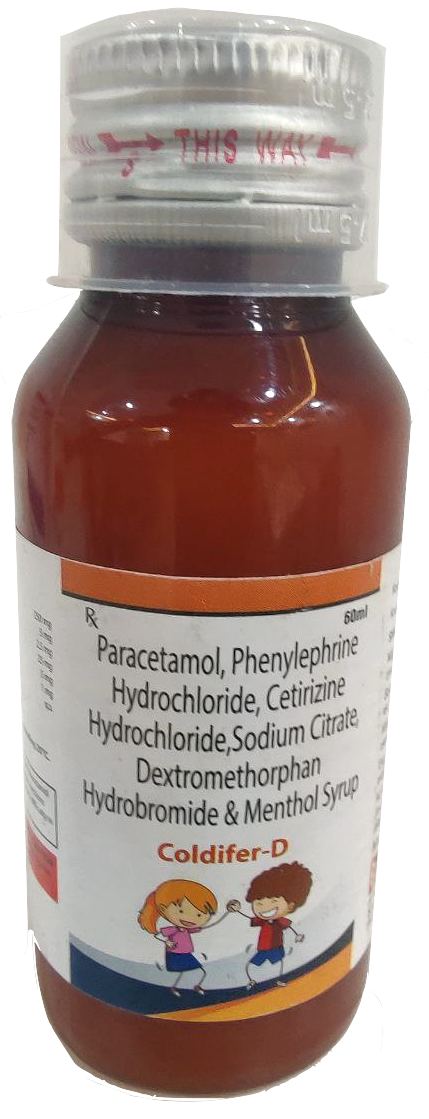 The Brand Name Has Generic Salt :: Cetirizine,Paracetamol,Phenylephrine,Sodium,Citrate,Dextromethorphan,Menthol COLDIFER-D :: 60ml Is From Company :: Not Available Priced MRP Approx. :: Rs. 75 COLDIFER-D :: 60ml have is comes under Sub class of Main Class The Brand Name COLDIFER-D ® Has Generic Salt :: Cetirizine (2.5mg) + Paracetamol (250mg) + Phenylephrine (5mg)...