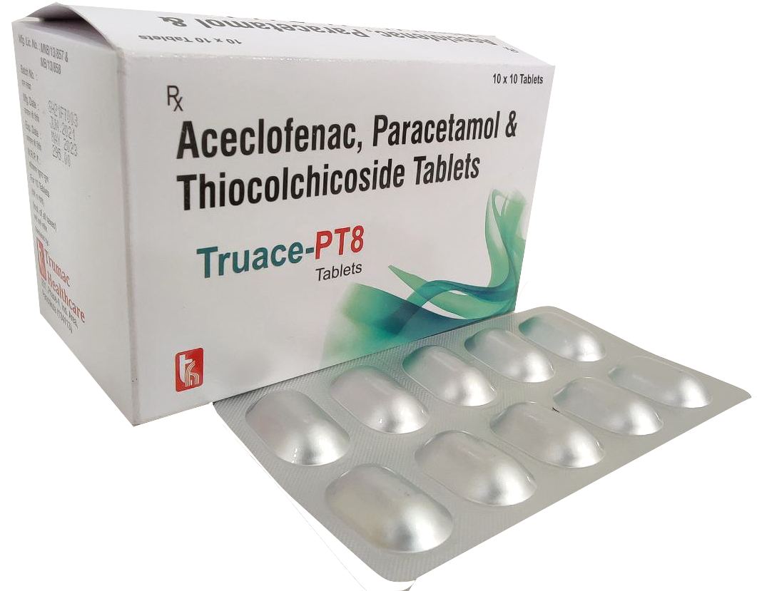 The Brand Name Has Generic Salt :: Aceclofenac,Thiocolchicodise TRUACE-T8 :: 10 x 10 (Alu-Alu) Is From Company :: Not Available Priced MRP Approx. :: Rs. 280 TRUACE-T8 :: 10 x 10 (Alu-Alu) have is comes under Sub class of Main Class The Brand Name TRUACE-T8 ® Has Generic Salt :: Aceclofenac 100mg...
